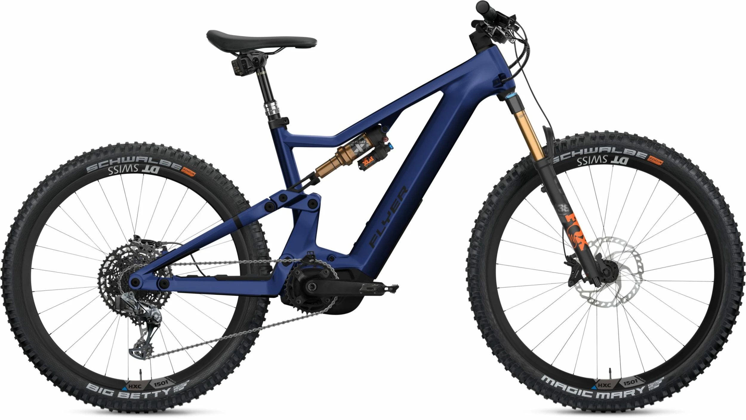 Le Flyer Uproc X 9.50 2022 est un VTT électrique tout-suspendu haute de gamme équipé de la transmission électronique Sram X01AXS. En plus de son cadre carbone, il combine une puissance impressionnante et une grande réserve d’énergie. Grâce au moteur Panasonic GX Ultimate Pro FIT 95 Nm, vous pourrez gravir n’importe quelle montagne, quelque soit le dénivelé. Le plaisir de rouler est garanti par la batterie Flyer FIB 750 Wh. Ses suspensions Fox parfaitement réglées avec débattement de 150 mm, lui permettent de briller aussi bien en descente qu’en montée. Ses roues mixtes – 29 pouces à l’avant, 27,5 pouces à l’arrière – en font un VTT électrique ultra agile.